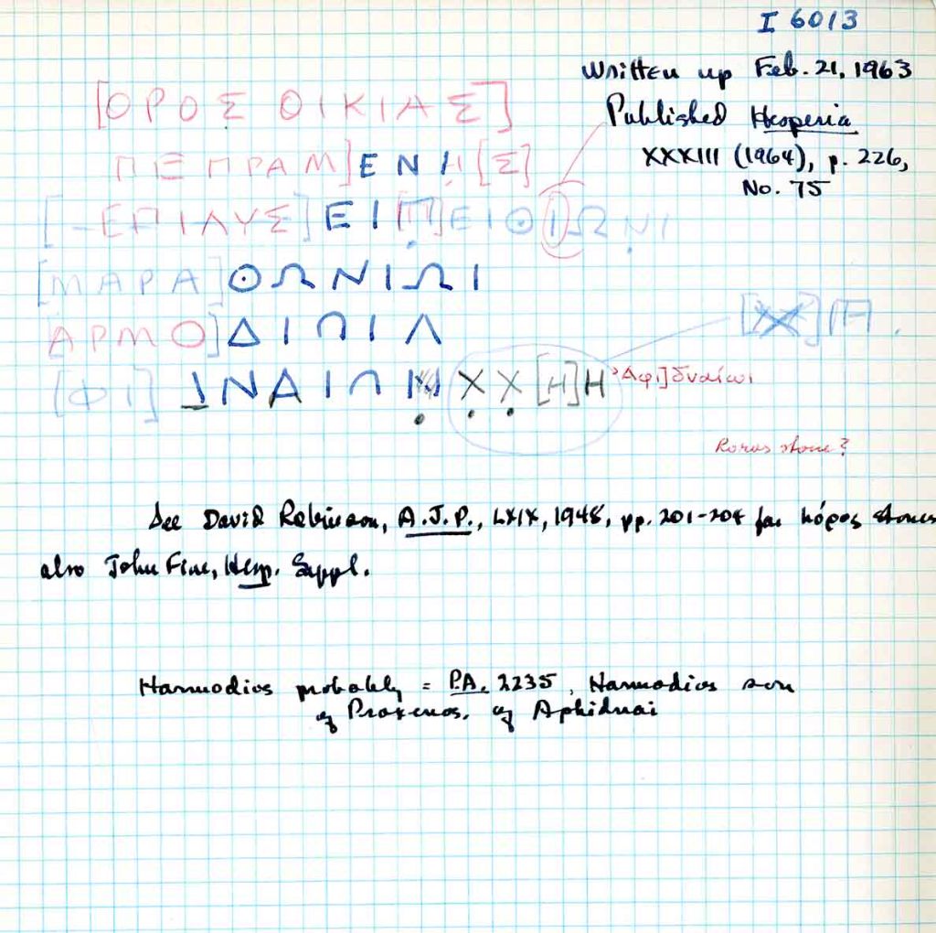 Before an inscription would be ready for publication, Meritt would usually add to his notebook (a) excavation information about the fragment; (b) bibliographical information if it (or other relevant stones) had been treated previously; and (c) ideas for letters/words to be restored in the gaps left on the stone.
