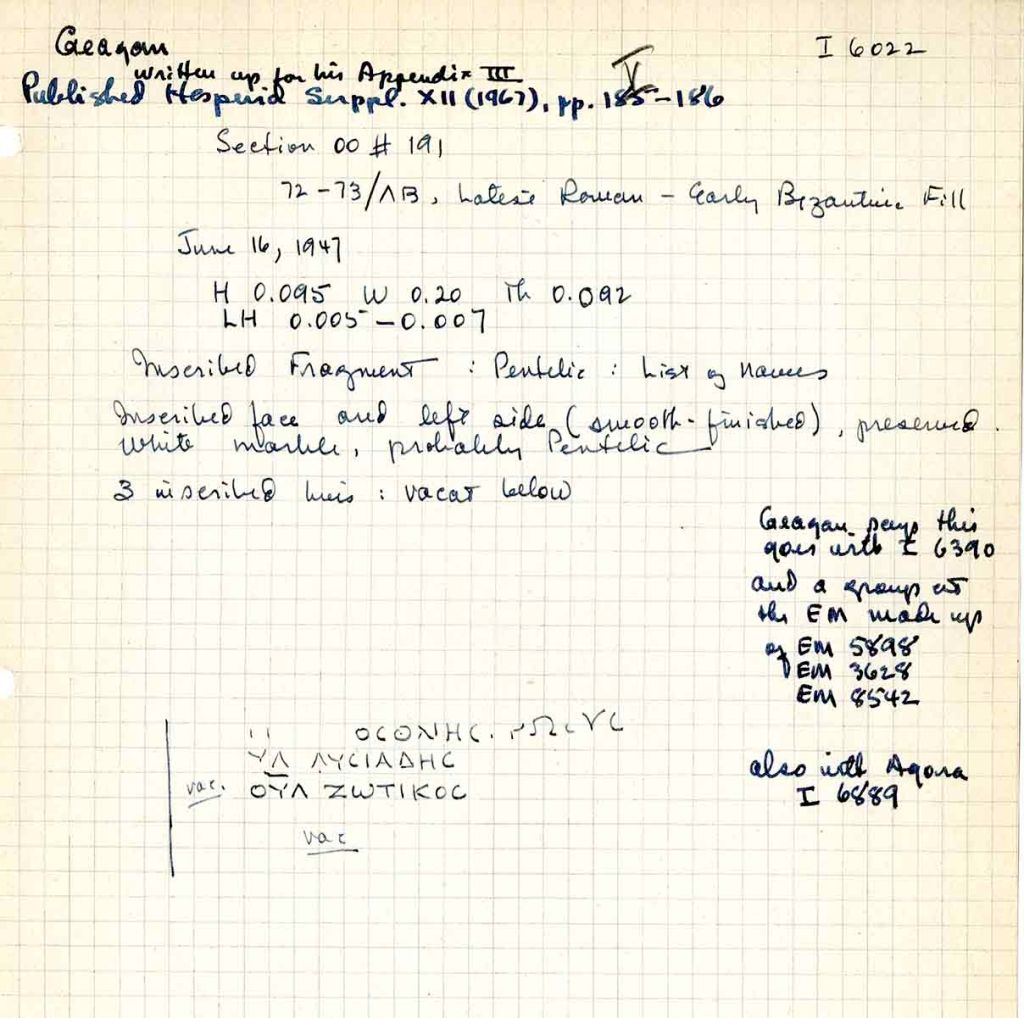 Beneath that material are written the letters on the stone, this time without the sketch of the stone itself that we saw with Agora I 6026. There are also a few bibliographical notes: that Geagan wrote up and published the fragment, and that he associated it with several other fragments listed by their EM (Epigraphic Museum) or Agora numbers.