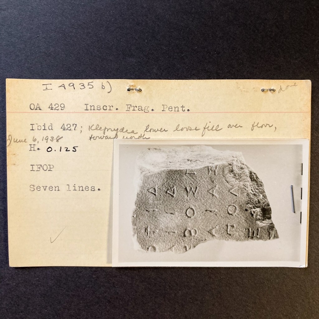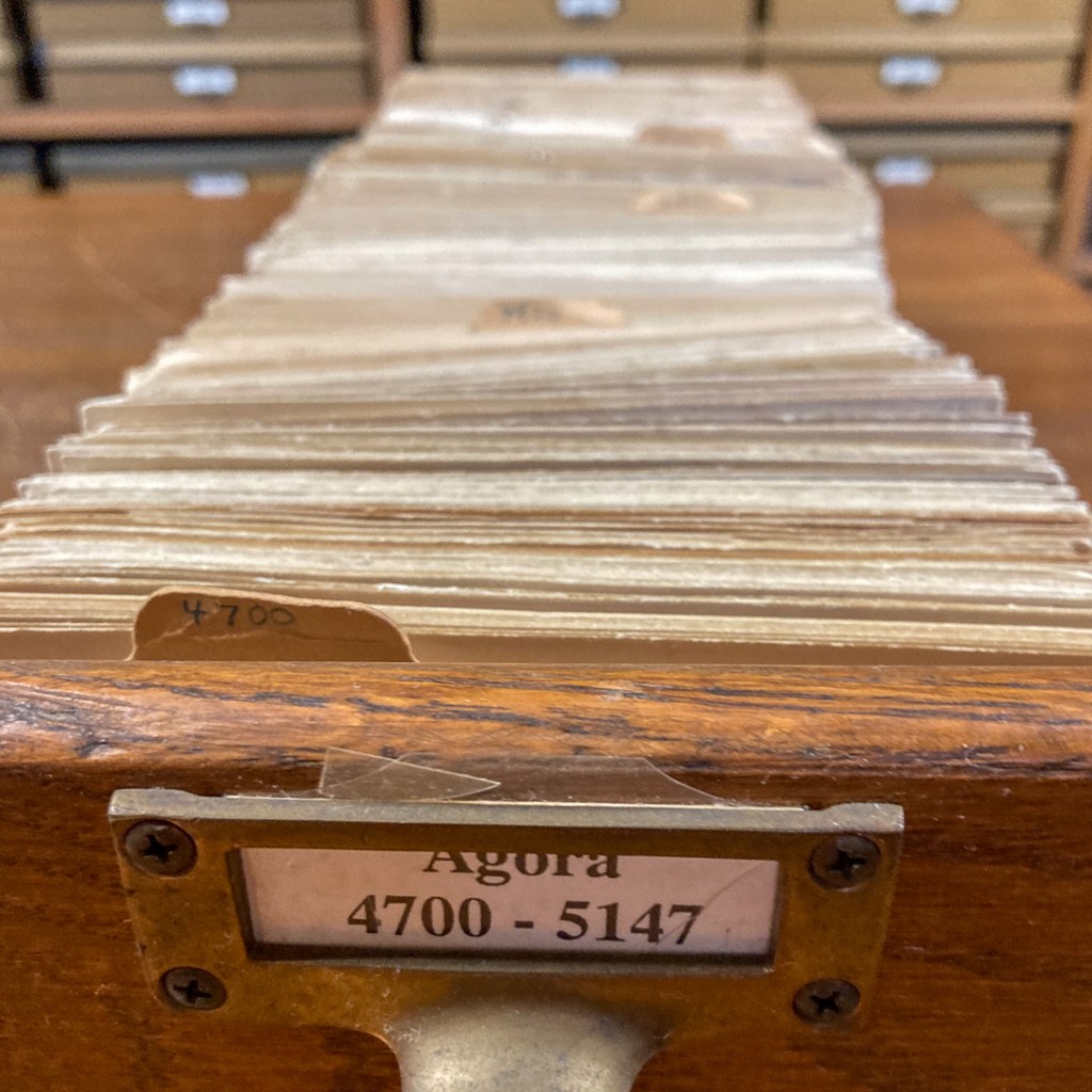 Below is an image of an opened drawer for Agora 4700-5147, and we’ve given two example cards: Agora I 2095 and Agora I 4935. In each case a small photo has been stapled to the card, and there are a combination of type- and hand-written notes. For 2095 there is even a cursory sketch of the letters and edge of the stone!