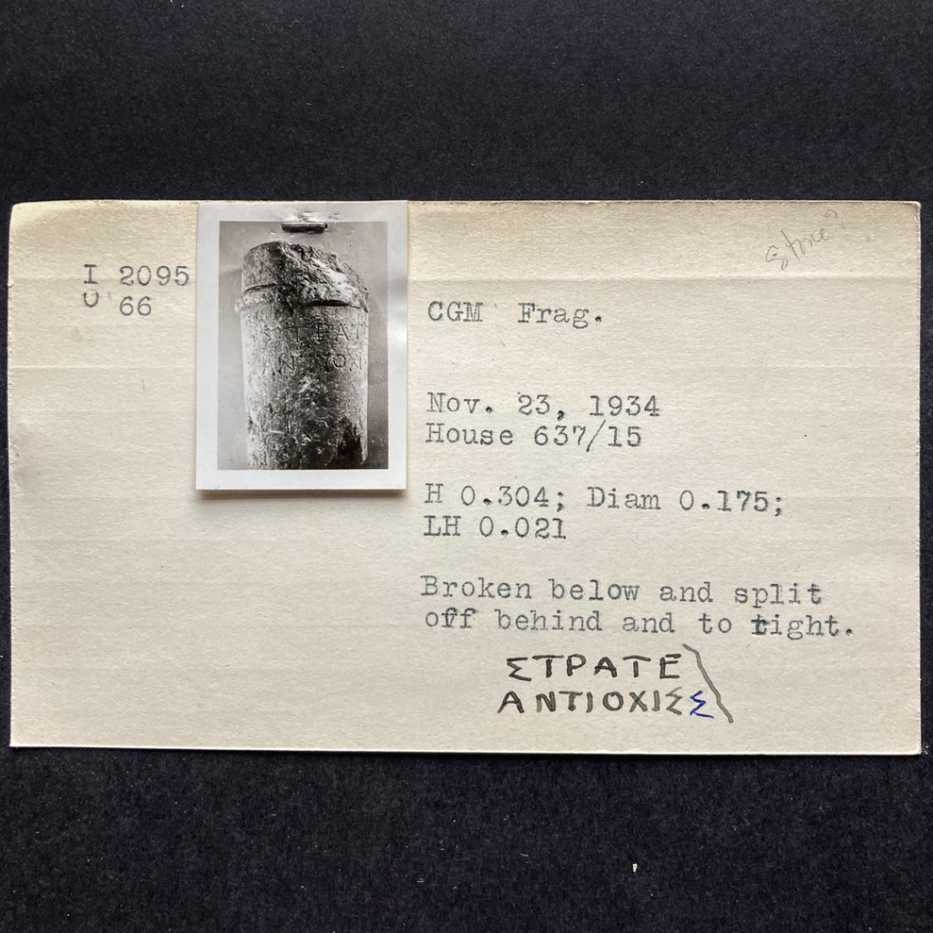 November 30, 2020: Meritt’s notebooks aren’t our only connection to the Agora excavation of the American School of Classical Studies at Athens! We’ve got two cabinets chock full of material on inscriptions from the Agora. The upper card file, perched on top of the metal cabinet, contains notecard copies of the excavation notes from the Agora.